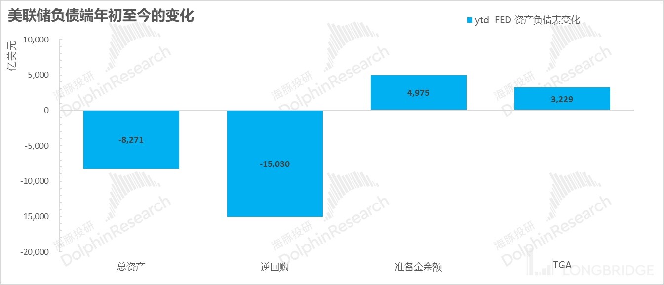 美国联邦政府到目前净融资金额是 2.3 万亿,美联储逆回购余额减少了 1.5 万亿,贡献了 65% 以上的融资金额。