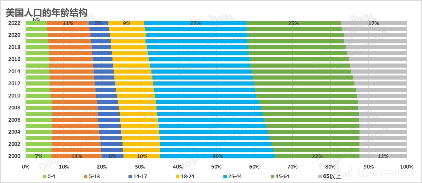 也就是说,美国人的年龄结构是小的变少,老的变多,但从年少到年老中间处于 “当打之年” 的青壮年人口则完全走了脱离 “年轮的独立行情”。