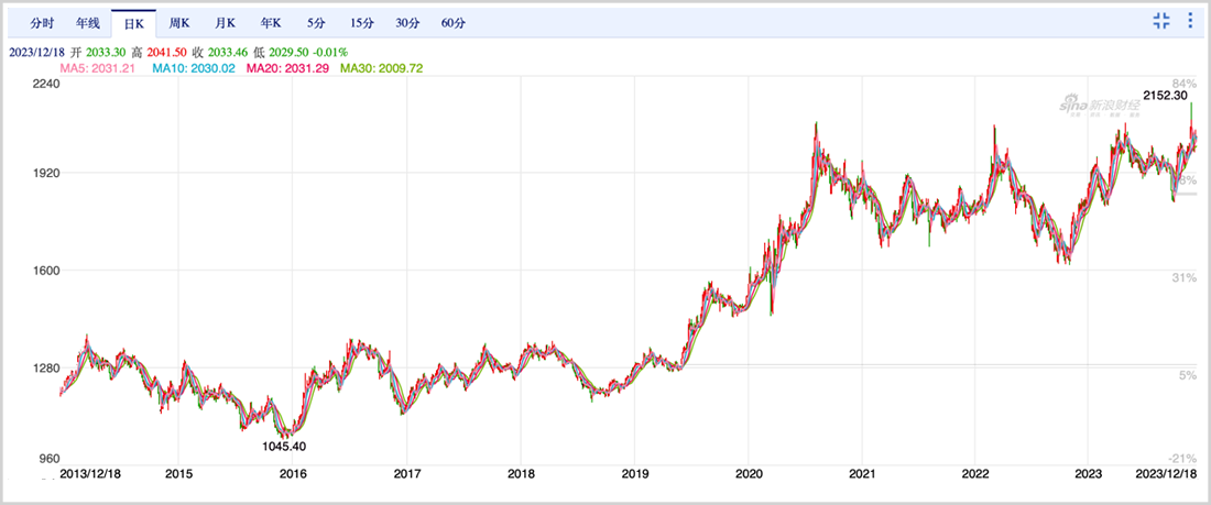 ▲纽约黄金期货近十年涨幅,来源:新浪财经