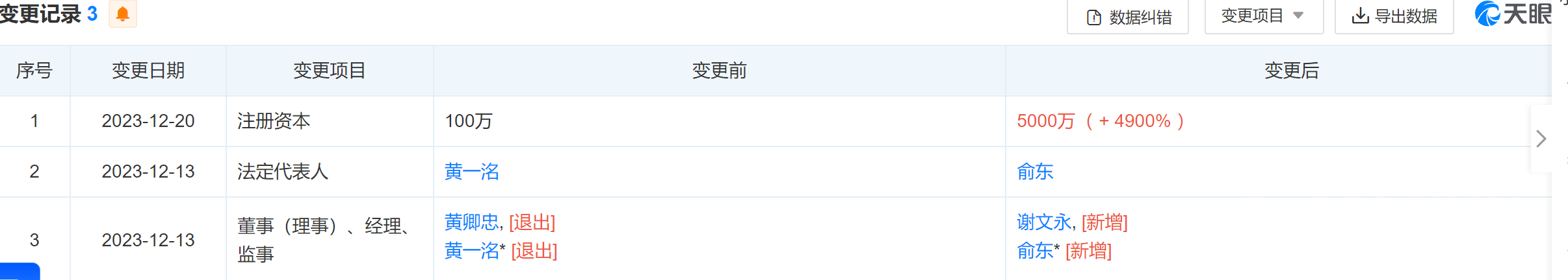 钛媒体APP发现,海南新国的法人代表为黄一洺,而北京吾明则在今年12月13日-12月20日之间突击变更企业信息,其中法人代表由黄一洺变更为俞东,而注册资本由100万元变更为5000万元。