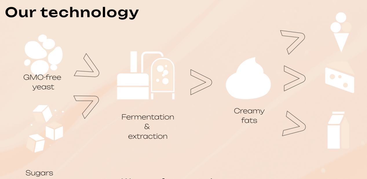 Cultivated使用非转基因酵母进行发酵,在发酵过程中用制糖副产品糖蜜喂食酵母,让酵母大量繁殖并在细胞内产生脂肪。当酵母充满油脂后,Cultivated将整个酵母菌体收集起来,将酵母细胞“打碎”,通过特殊的提取工艺从酵母中获取类似动物乳制品中的“奶油”脂肪。不同于许多模仿复制蛋白质(比如乳清蛋白和酪蛋白)的做法,Cultivated通过复制动物奶油脂肪及其微观结构成分,让酵母中的脂肪具备与动物乳制品相同的质地和口感。