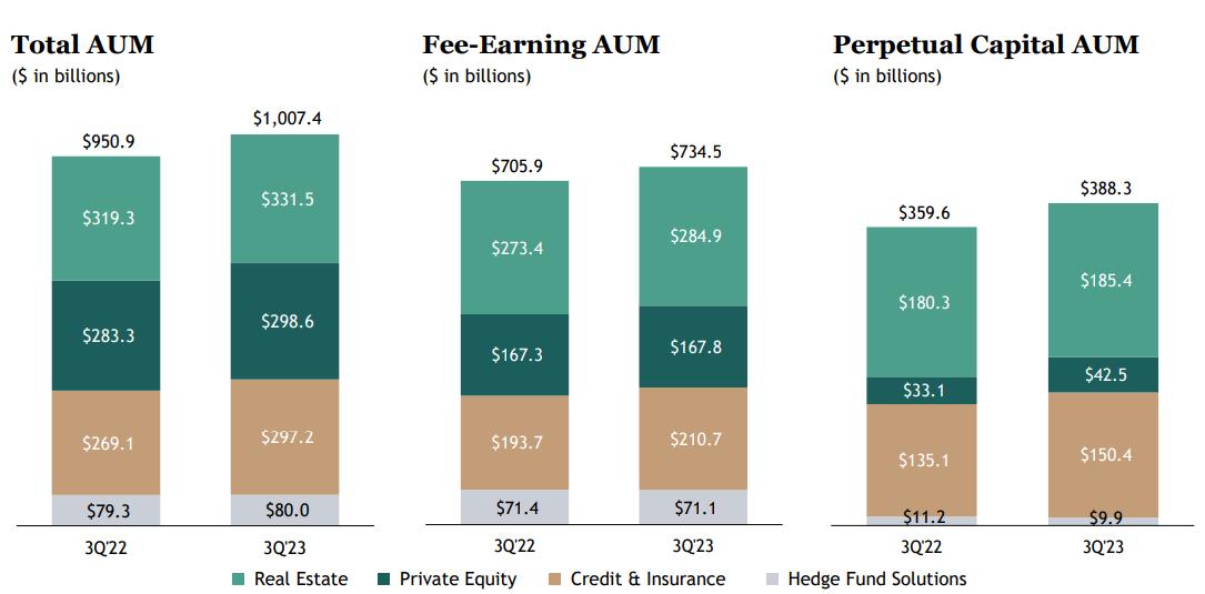 但黑石的“贪婪”绝不止于此,苏世民在黑石创立之初就认识到多元化投资的重要性,所以随着公司发展,黑石将业务触角伸向了更多的领域。黑石也从最初的私募股权投资公司,转变为综合性的另类资产管理集团。它的投资之道和对于资产的管理方法,转化为了超强的募资能力和收益回报。截至2023年9月30日,黑石的资产管理规模,突破1万亿美元,达到了10074亿美元,同比增长6%,其中仅私募股权基金的管理规模就高达2986亿美元。