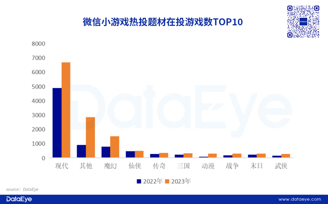从热投题材来看,现代题材参投产品最多,其他、魔幻增量最高。2023年微信小游戏在投产品最多的为现代题材,达6697款,多为休闲益智类IAA,虽然数量多但多为入局试水、小幅投放。