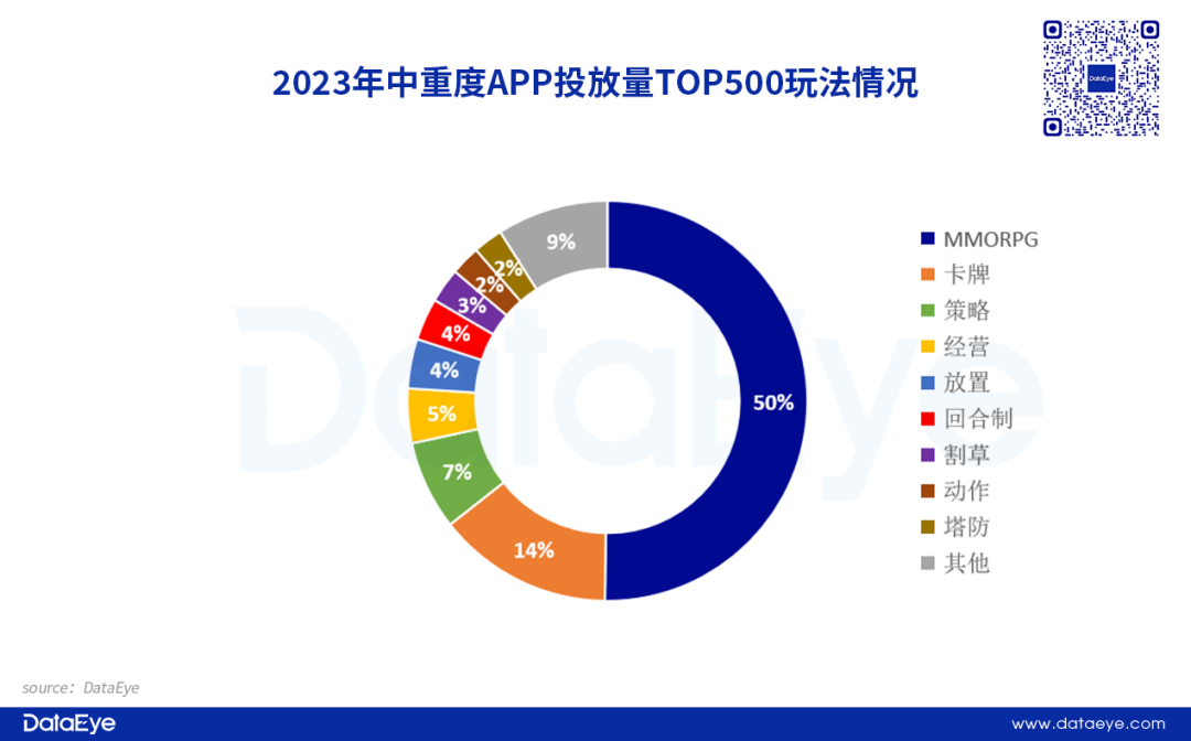 从玩法来看,MMORPG一家独大。2023年热投手游APPTOP500产品中,MMORPG玩法产品占比约为50%,今年有多款热门大作抢量,例如网易《逆水寒》、三七《凡人修仙传:人界篇》等,导致MMO市场抢量竞争严重,进而使得全年买量素材暑期冲高后大幅下滑,而参投游戏则全年持续下滑。
