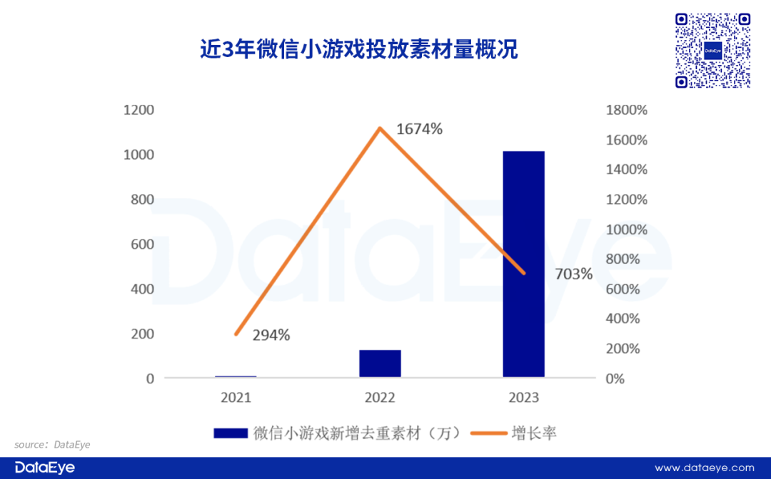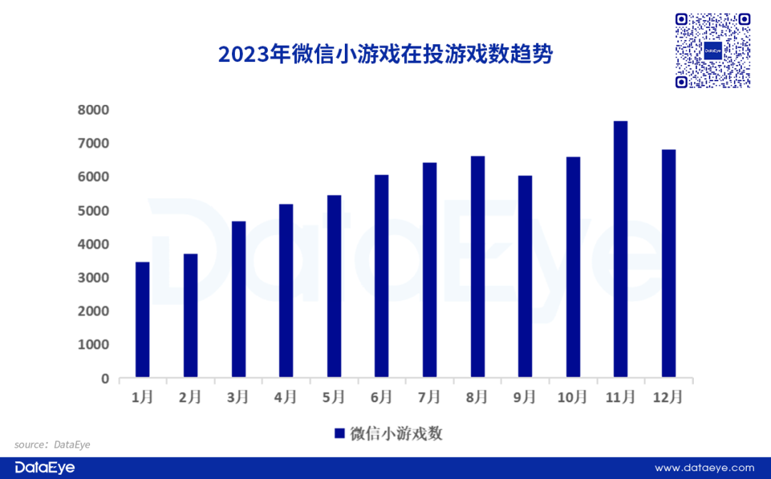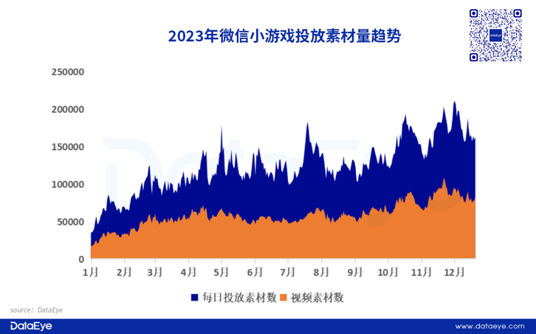 2、小游戏端:小游戏赛道在今年迎来爆发式增长,投放素材量和在投游戏数均创下历史新高。