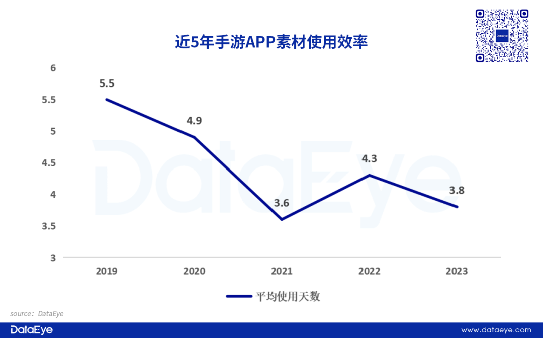 从素材使用效率来看,2023年单个手游APP新增素材平均使用天数为3.8天,处于较低的水平。0-5天的素材占比为85%。素材生命周期较低,意味着消耗较快,需不断“堆素材”获量。