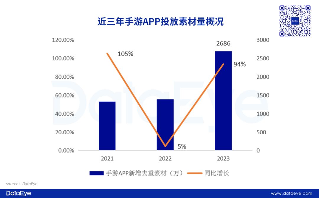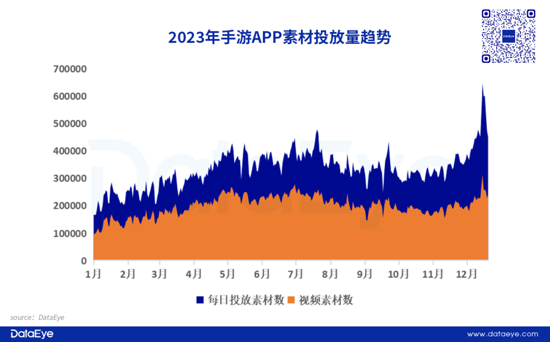 2023年,手游APP买量市场快速回暖。全年手游APP投放素材量(去重)2686万,同比增长94%。12月中旬,《蛋仔派对》《元梦之星》史诗级对决,致大盘素材激增。