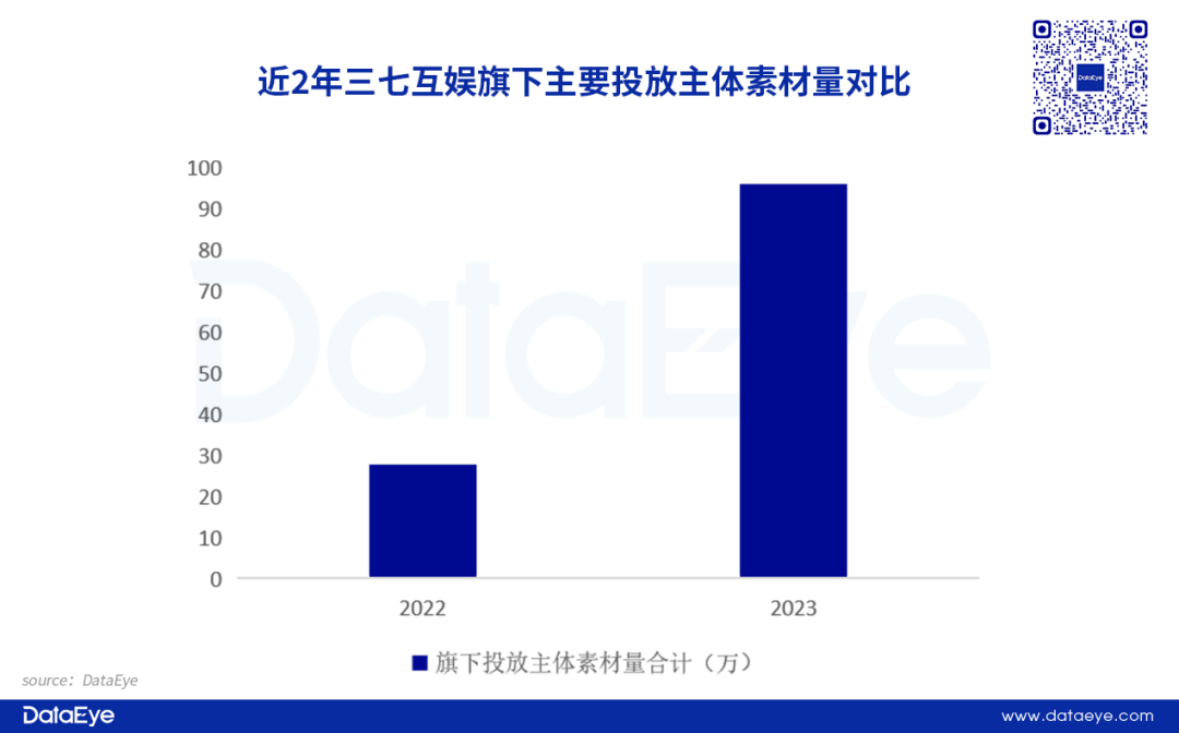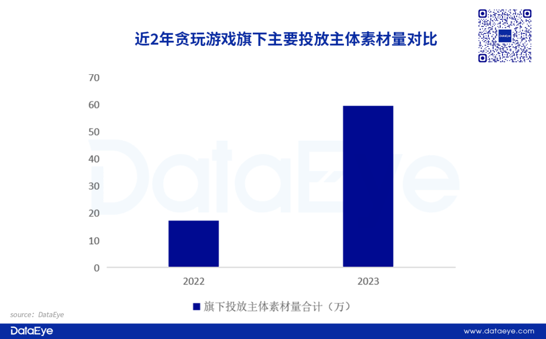 贪玩游戏旗下产品《原始传奇》手游版本今年投放量保持强势,全年投放约7.5万组。另外,旗下《原始传奇》小游戏版本在今年增加买量投放,全年投放素材超过17万组,拉升贪玩投放大盘。