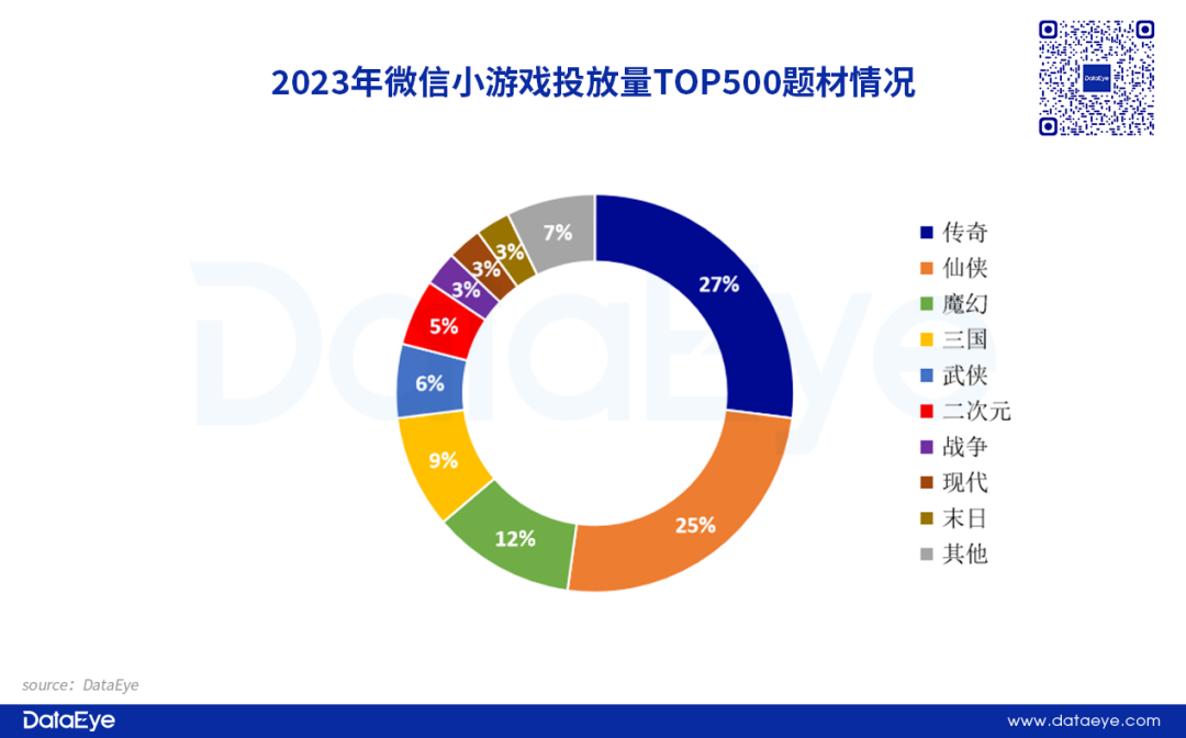 从题材来看,传奇、仙侠热投,二次元题材表现不俗。传奇品类占比最高,仙侠次之,二者合计占比超过50%;现代题材热投产品占比仅为3%,与在投产品相比有着巨大的差距;二次元题材热投产品占比约为6%,虽然在投产品较少,但跑出的产品多,整体赛道在小游戏领域表现不俗。