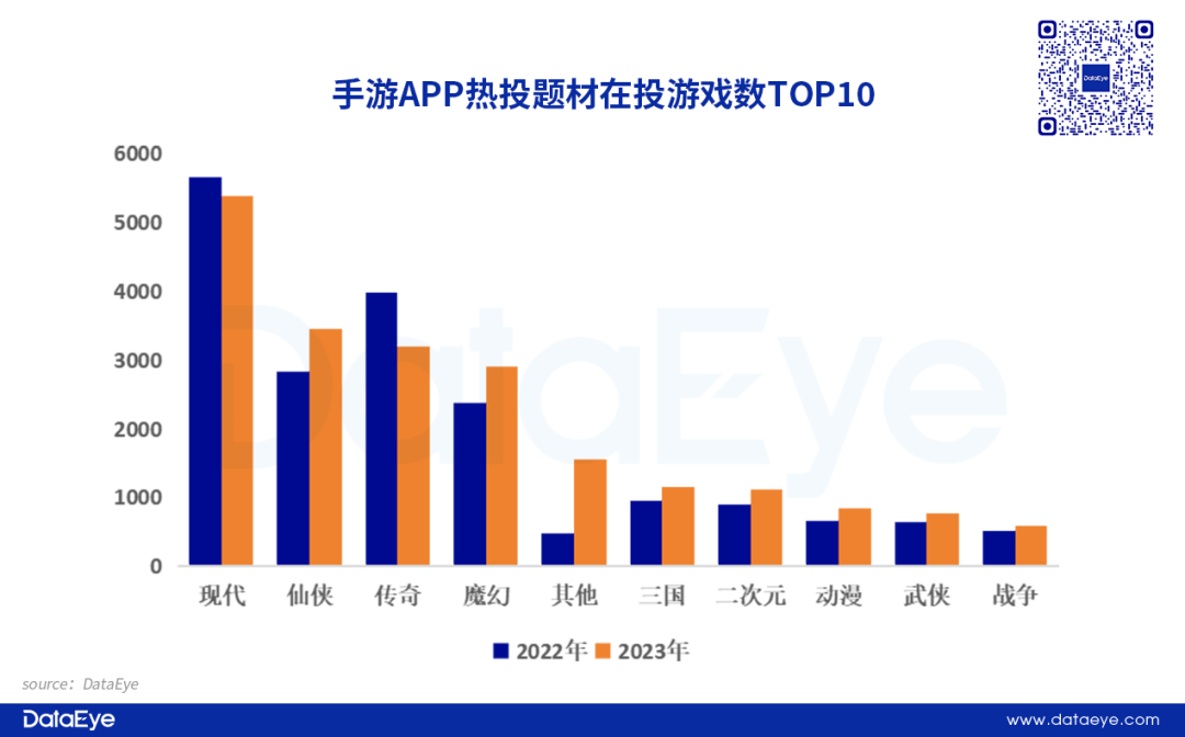从题材来看,传奇、仙侠位居前二,现代题材热投产品少。2023年中重度手游中,传奇品类占比最高,仙侠次之,买量大户地位不可撼动。现代题材占比仅有5%,热投产品数远低于在投产品数,说明大部分现代题材产品投放力度偏低。