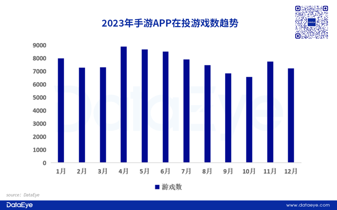 2023年手游APP在投游戏数量同比增长10%,创下近三年新高。整体来看,主要得益于游戏版号恢复常态化发放,新游大量涌现;同时,一些研发周期短、投放素材极低的休闲益智IAA类游戏入局试水,推高了在投游戏数。