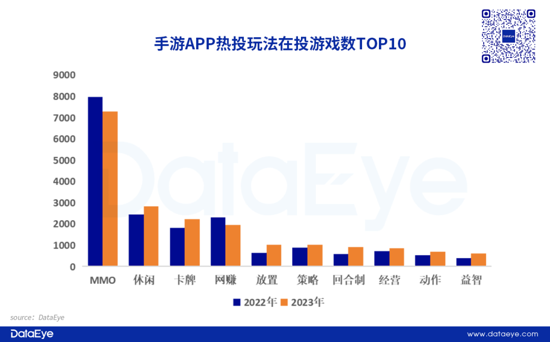 从热投玩法来看,MMO在投游戏数断崖领先,但投放游戏数同比下滑。MMO依然断崖式领先,但同比小幅下滑,网赚类同样下滑跌出前三,这两大赛道产品同质化显著,今年竞争激烈、淘汰剧烈。另外,国内玩家需求发生变化,轻量化、玩法多品类更有优势,例如休闲、卡牌、放置(含开箱子)都有较大增长。