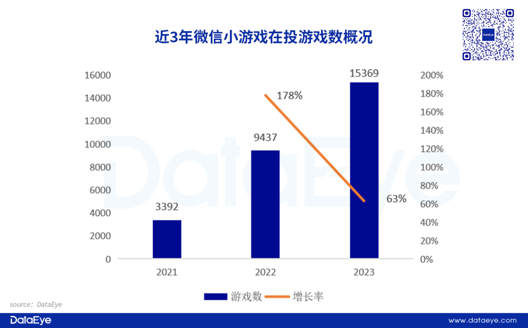 2023年微信小游戏在投游戏数突破1,5万款,同比增长63%,但增速有所放缓。预计2024年在投游戏数依然增长,但增速或进一步回落。