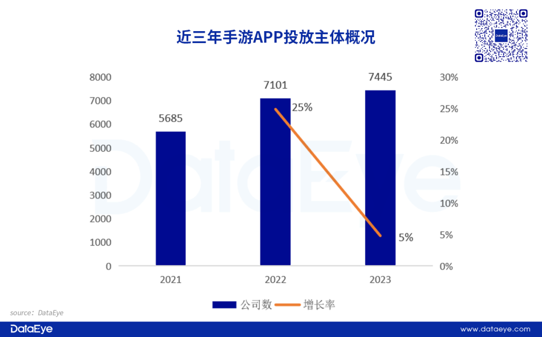 2023年手游APP在投企业/公司/个人主体同比增长,但增速下滑至4.8%。DataEye研究院认为,市场一度受大环境影响,公司裁撤项目、关闭子公司等影响了参投主体数量,今年有所回暖。
