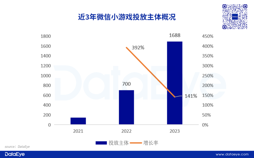2023年微信小游戏入局者增多,同比增长141%。小游戏研发周期较短,“尝试性入局”情况较多,市场快速“大浪淘沙”。