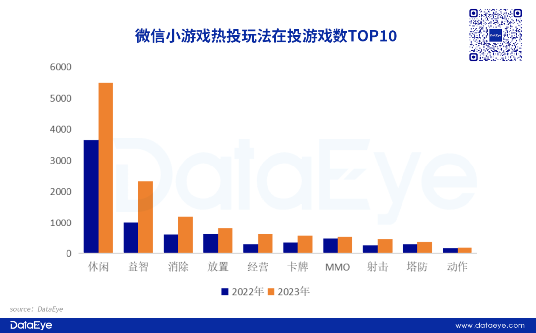 从热投玩法来看,休闲、益智、消除居多,同时增量也最多。2023年在投微信小游戏各玩法总体都有不同幅度增长。其中,休闲玩法增长明显,轻度化玩法依然受到小游戏玩家的青睐。