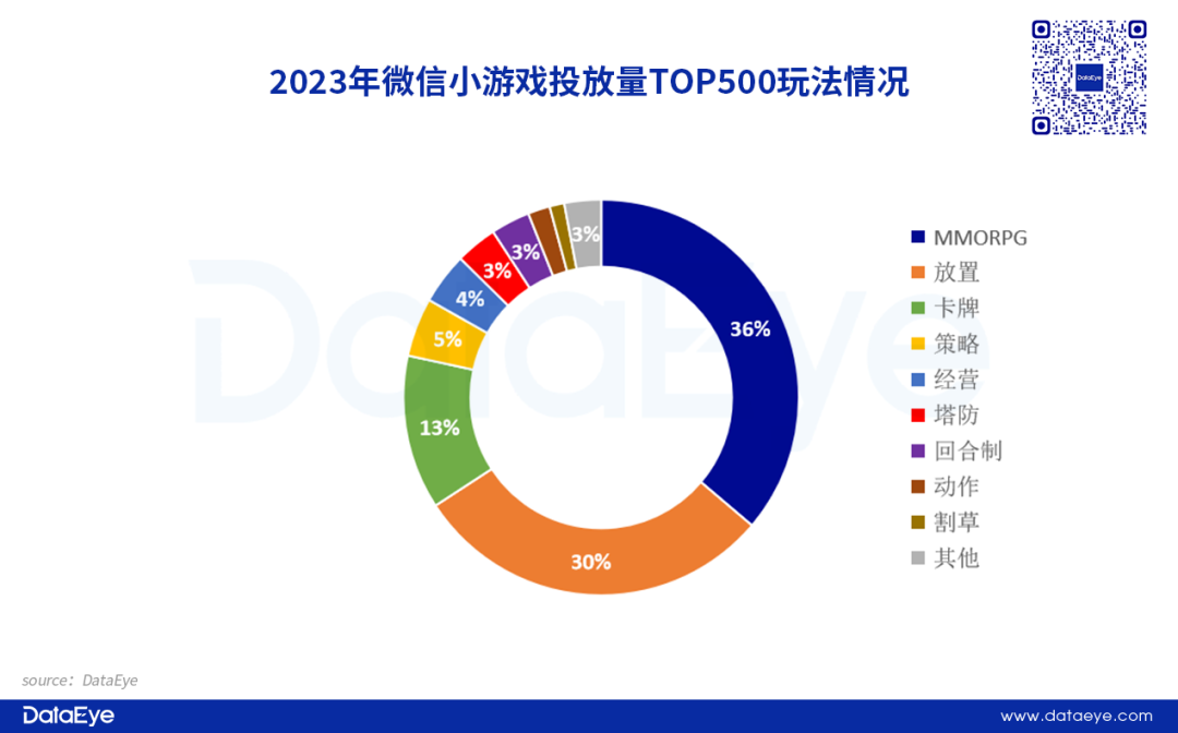 从玩法来看,MMO、放置在微信小游戏表现突出。2023年微信小游戏MMORPG与放置(含开箱)形成两强局面,二者合计超过大盘的2/3,其中MMORPG在Q2在投产品最多,而放置(含开箱)品类投放素材量和在投游戏数持续增长,Q4达到全年顶峰,买量形势持续高涨。