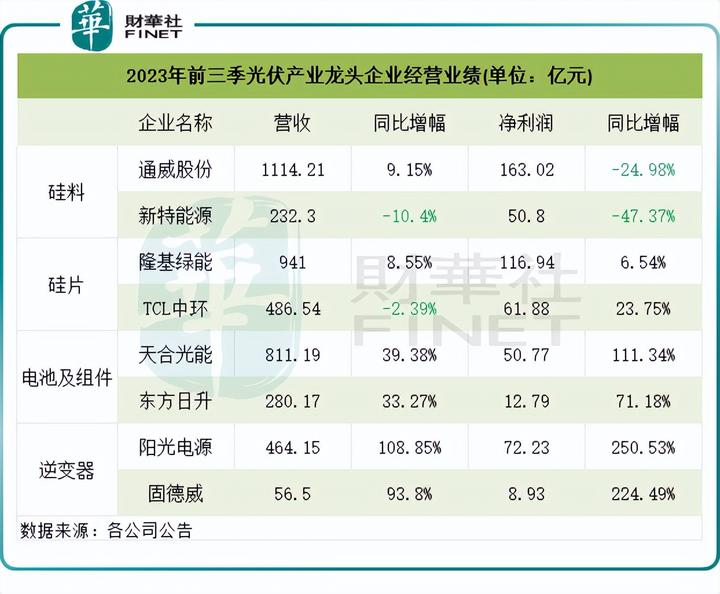 而行业龙头则整体表现出“风景这边独好”的景象。今年前三季,硅料领域的通威股份和新特能源(01799.HK)受产品价格下降影响,利润均有不同程度下滑,其中新特能源收入和净利润双双下滑。