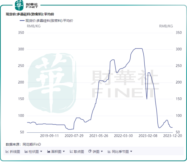 以硅料价格为例,多晶硅料(致密料)价格在2022年11月触顶后便开启了一泻千里模式。截至12月20日,多晶硅料(致密料)平均价仅为65元/公斤,相较于去年巅峰时期303元/公斤跌去了接近8成。