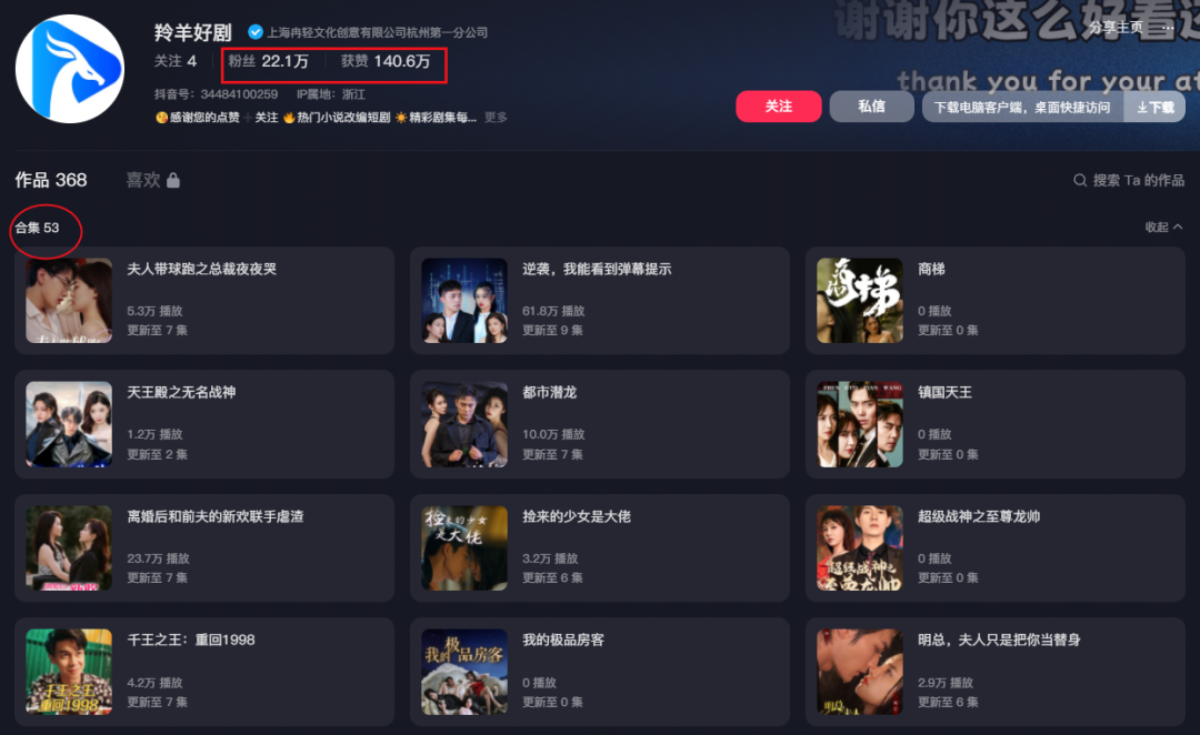 截至目前,网易羚羊抖音账号“羚羊好剧”已上线53部热门小说改编短剧,粉丝数超22万,点赞超140万。