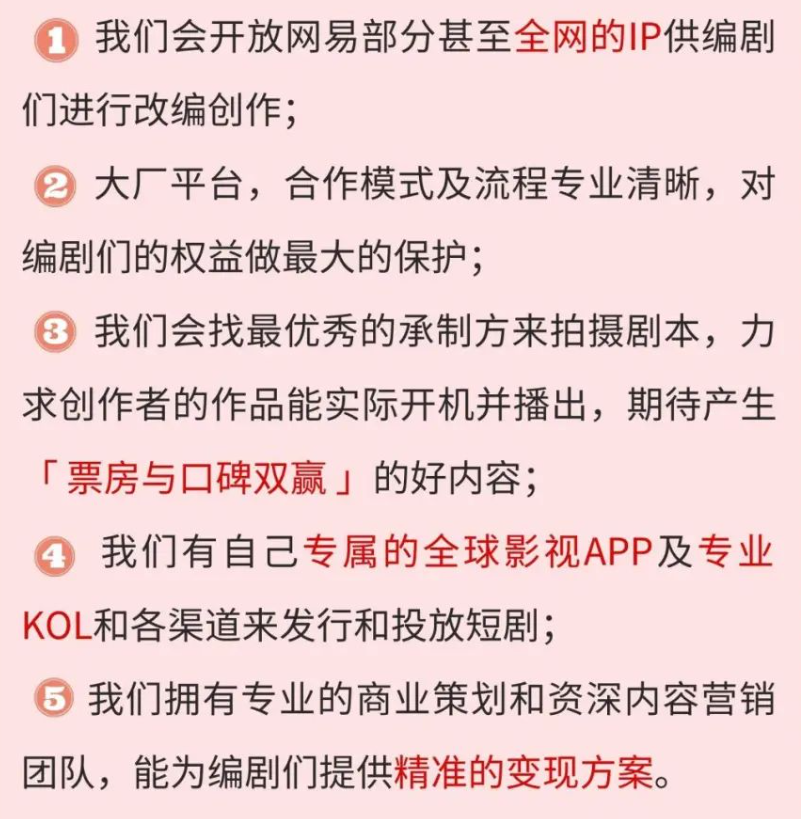 官方开出的优惠条件是——开放网易部分甚至全网的IP,以及专属的全球影视APP及专业KOL和各渠道来发行和投放短剧。