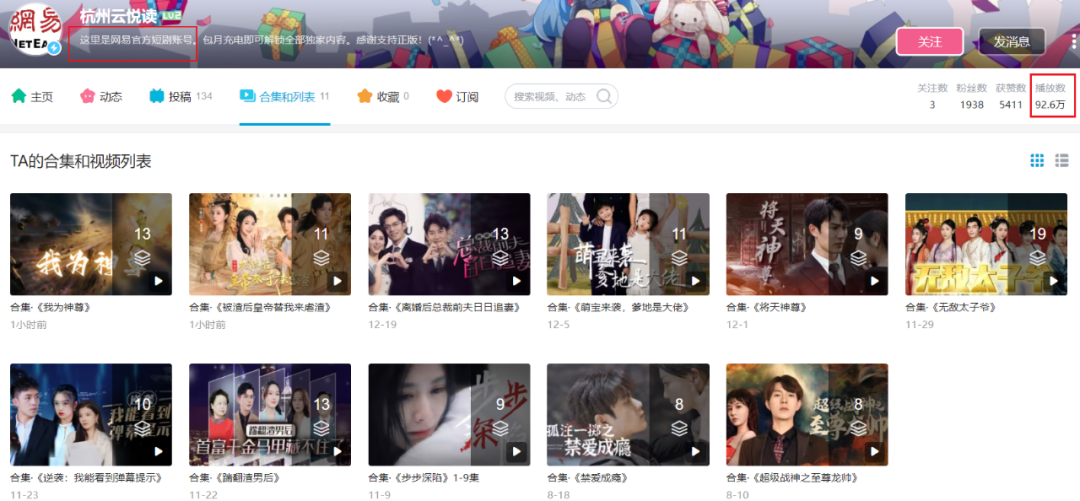 网易羚羊B站官方短剧账号“杭州云悦读”,已上线了11部短剧,累计播放量超92万。其中《萌宝来袭,爹地是大佬》曾位列12月11日短剧热力榜第2名。