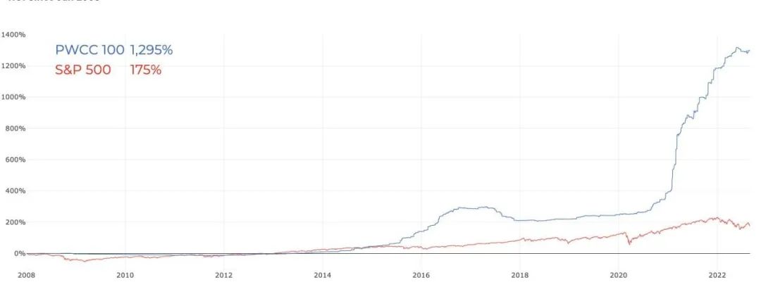 PWCC100 指数与标普 500 指数对比图,注:数据截止于 2022 年 8 月 30 日,100 指以 100 张卡牌为单位|图片来源:PWCC marketplace