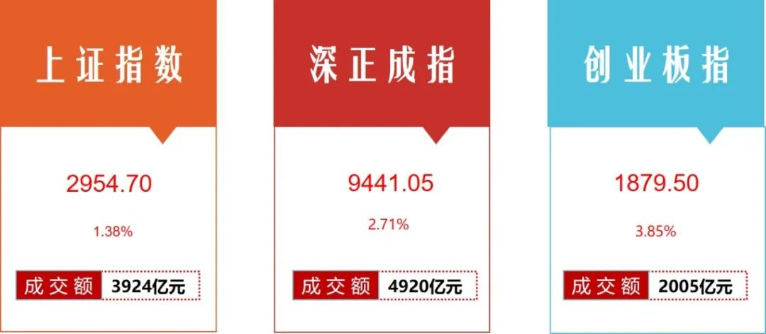 今日收盘,沪指报2954.70点,涨1.38%;深成指报9441.05点,涨2.71%;创业板指报1879.50点,涨3.85%。两市成交额8844亿元,较上一交易日大幅放量2476亿元,超4400只个股上涨。今日,北上资金净流入158.26亿元、净买入135.58亿元。