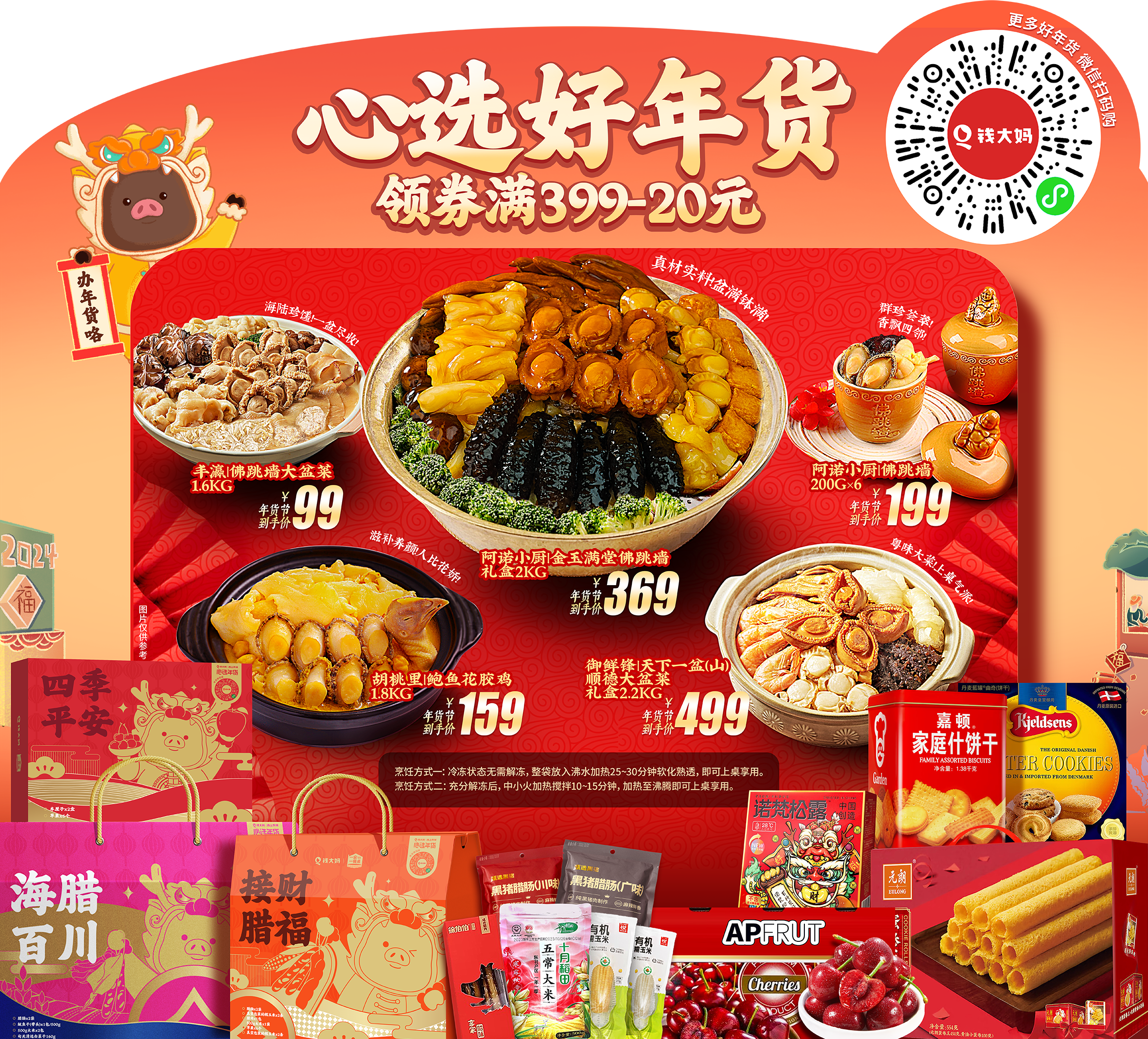 2024年钱大妈年货节将于近日正式启动,本次年货节的主题为“一家一餐桌,拴住鲜年味”。首批心选好年货推出经典粤味大菜,包括金玉满堂佛跳墙、鲍鱼花胶鸡、天下一盆(山)大盆菜等,各种海陆珍馐,由星级大厨精心研制,料足味美,年味满满。