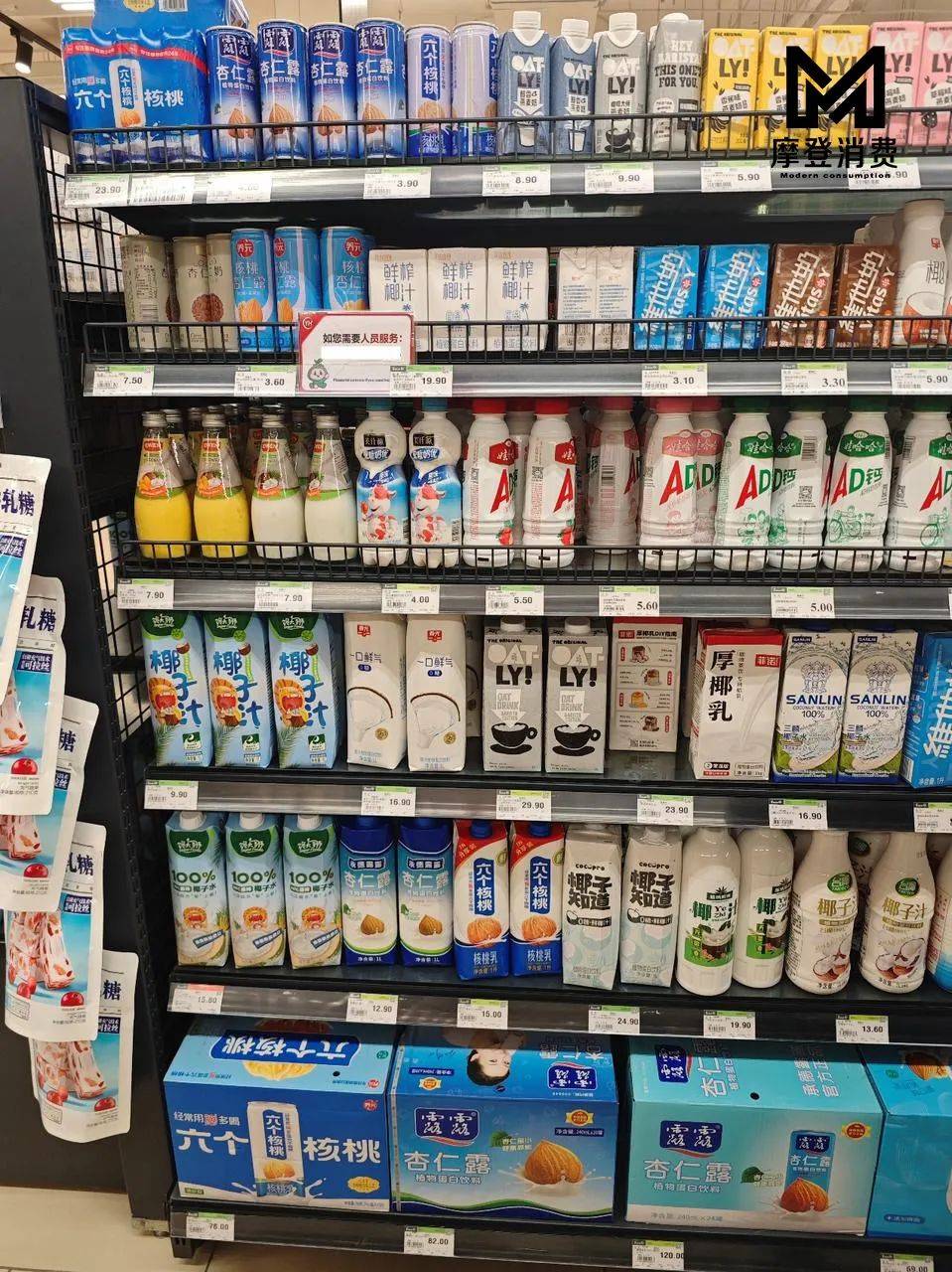 “杏仁奶新品没有优惠,整箱买也是一瓶7.5元。”超市酒水饮料区的销售员对「摩登消费」表示,他观察过,这个价位下,有消费者愿意买一瓶新品尝试一下,但更多的人看到7.5元的价格后,将手伸向4元的杏仁露或者其他品牌的饮料。