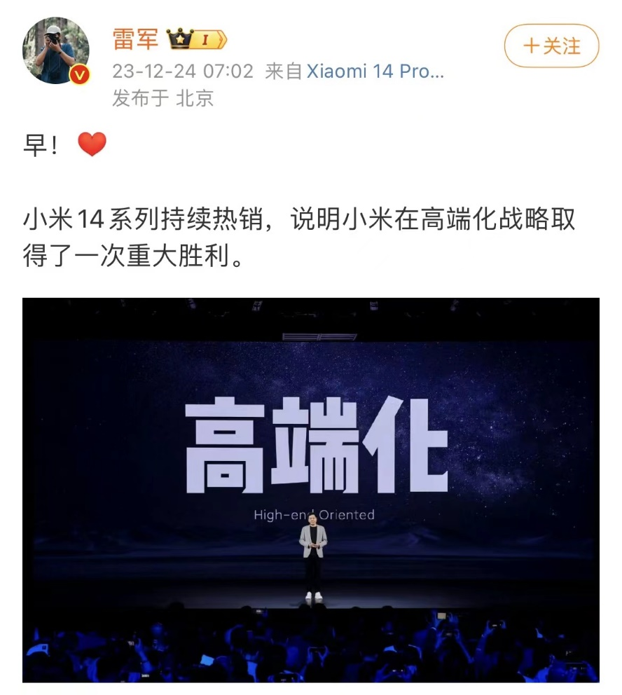 具体来看,早在去年2月,雷军就曾面向小米员工发布内部信表示,“高端之路是小米成长的必由之路,也是小米发展生死之战。”随后虽然有人对这一战略提出质疑,但小米却通过从小米12S Ultra、小米MIX Fold2到小米14系列的高端产品线逐渐掌握了高端化战略的方法论。