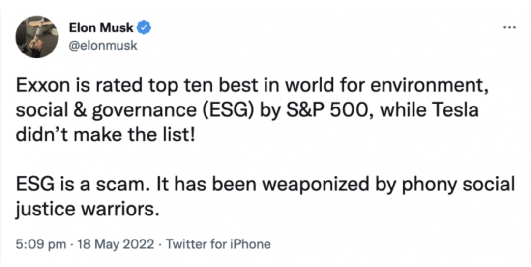 马斯克曾在推特上公开抨击,“ESG是魔鬼的化身。”“ESG是一个骗局。它已被虚假的社会正义战士武器化。”