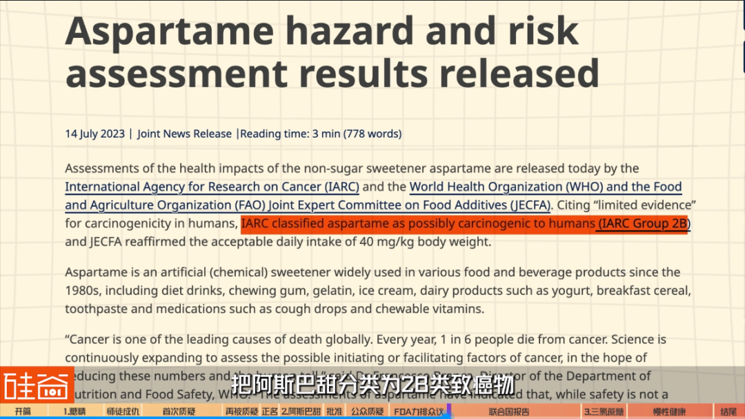 2023年年中,世界卫生组织WHO旗下的国际癌症研究机构IARC发布报告,把阿斯巴甜归为2B类致癌物,也就是,对人类有可能致癌。