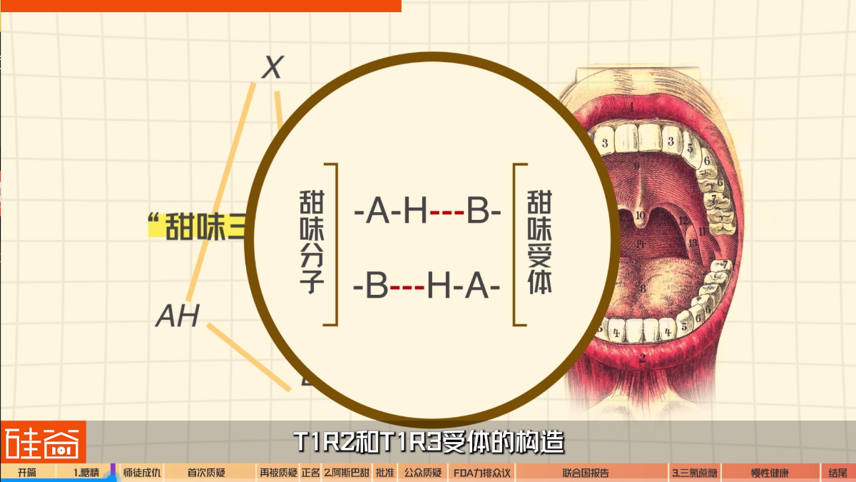 我们味蕾上感受甜味的T1R2和T1R3受体的构造,正好能和“甜味三角形”的结构匹配上。受体上的AH结构和甜味食物上的B原子结合,形成氢键,受体上的B原子又和甜味物质上的AH结构结合、形成氢键,从而让人感觉到甜味。