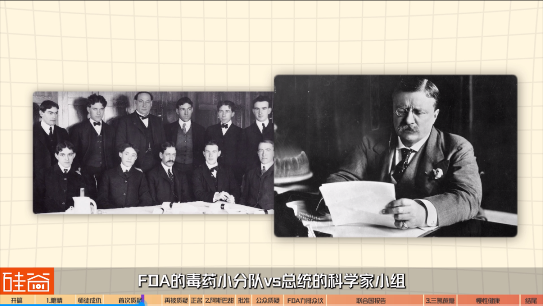 他们引起了舆论的关注,推动了各种食品安全法案的通过。当时威利可以说是食品安全监督的旗帜性人物,不出所料,1908年,威利也提议了禁止糖精的使用。不过时任美国总统的罗斯福却支持了糖精,因为他本身需要减肥,他说“你们说糖精对身体有害?怎么可能,我的医生Dr. Rixey每天都给我吃!任何说糖精对身体有害的人都是傻子”。但罗斯福还是得拿到数据来反驳哈维·威利,于是,他安排了一个科学家小组,来对当时美国政府对于食品添加剂的政策进行评估。不过小组的主席,正好是糖精的发现者之一,之前提到的和法勒伯格反目成仇的导师伊恩·雷姆森。毕竟是自己的科研发现,雷姆森领导的评估小组不出意外地将糖精认定为安全。所以,FDA的毒药小分队 vs. 总统的科学家小组,结果是后者获得了胜利。