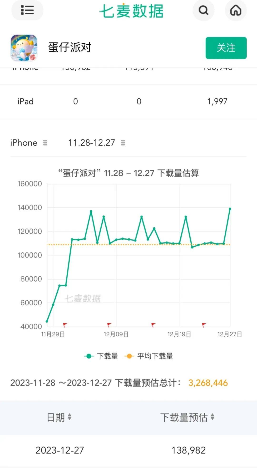 在iPhone设备端,《蛋仔派对》12月(近30日)预估下载量为327万次,较今年2月的360万次下滑9.2%;在收入预估上,11月28日-12月27日为1600万美元,较今年2月的2395万美元下滑33.19%。