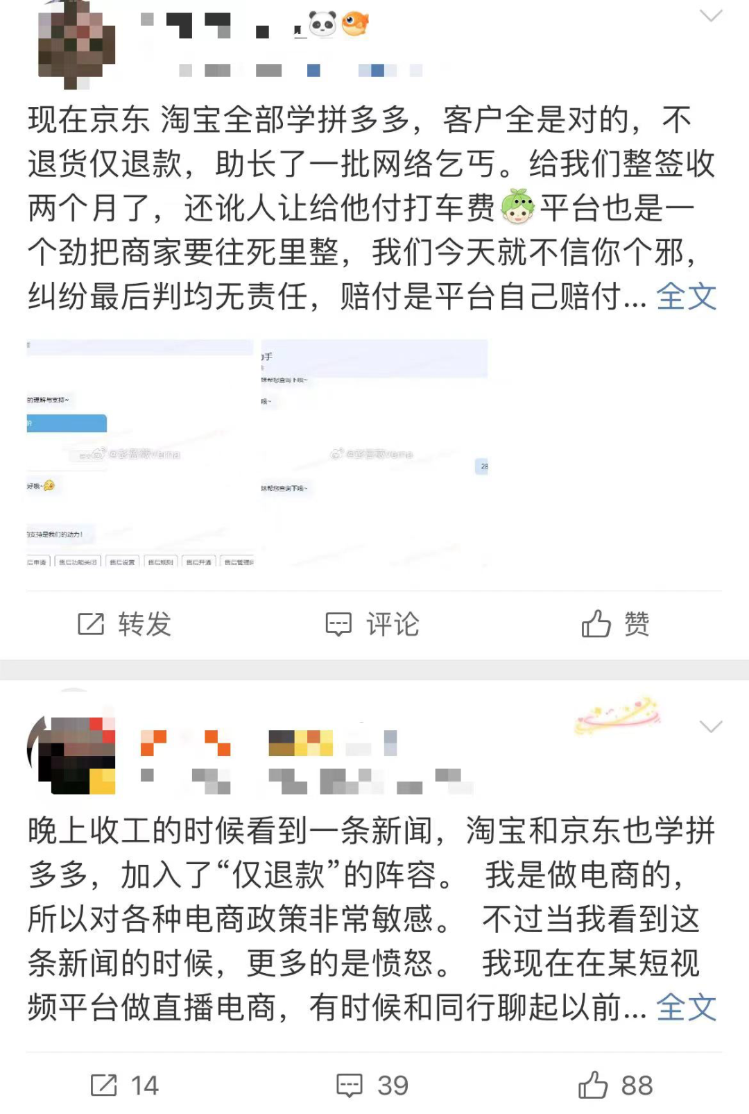 比如在淘宝平台,已经有商家在社交平台吐槽仅退款策略,表示要换个平台。还有商家表示,商家也是消费者,对推广效果不满意能不能让淘宝把推广费仅退款一下。商家们的不满和疑惑,必然有一定道理。