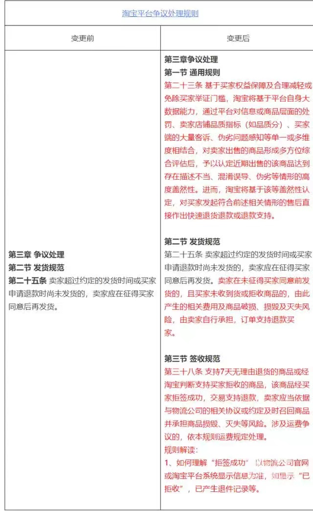变更第二条关于发货规范:“针对卖家存在延迟发货、强制发货的且未经买家同意的情形”,由此产生的相关费用及商品破损、损毁及灭失风险,由卖家自行承担,订单支持退款买家。