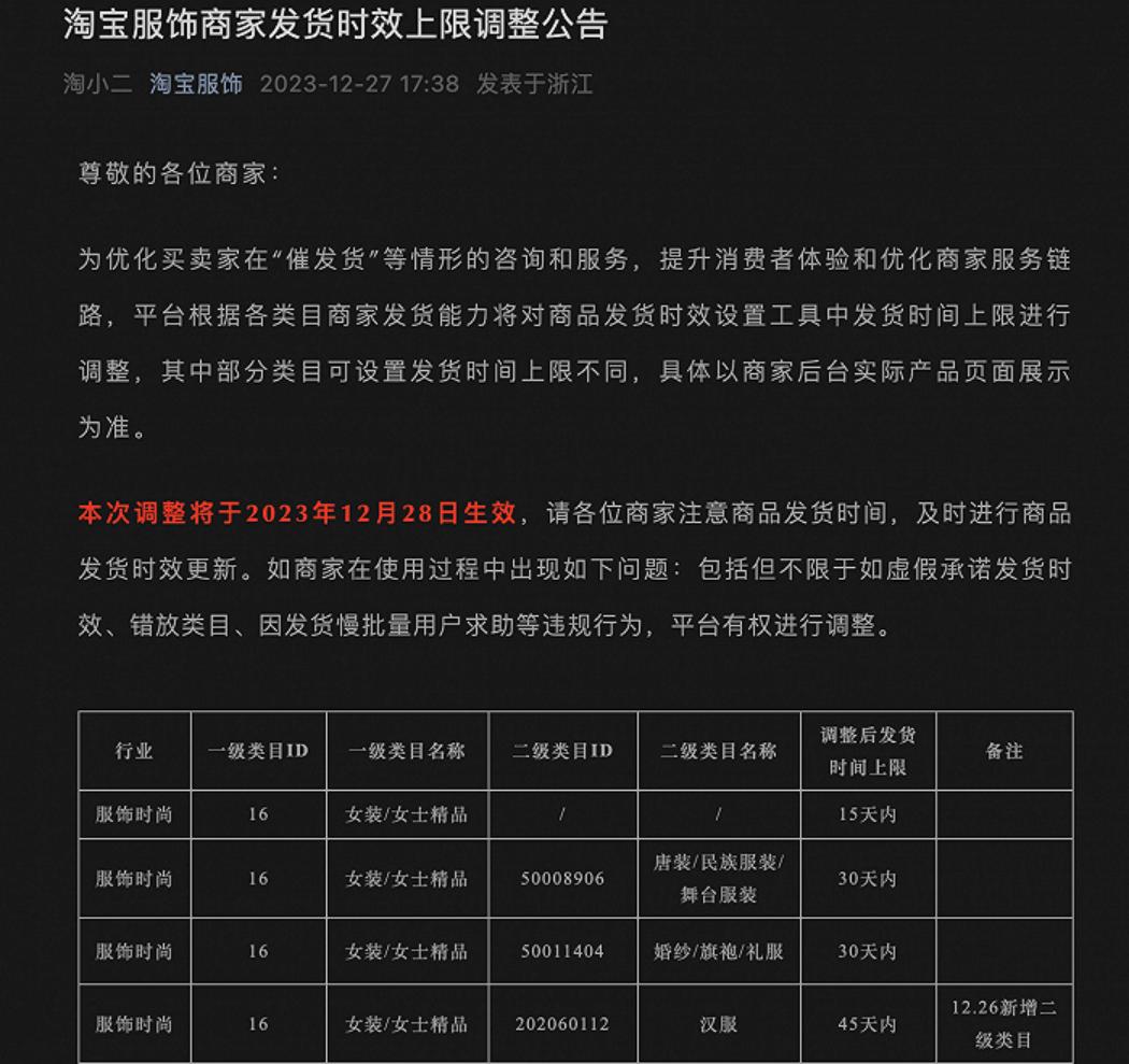 不只是"仅退款",为了提升核心品类——服饰的用户体验,淘宝还对大家诟病已久的预售动了刀。淘宝服饰发布公告,对商家发货时效上限作出调整,日常女装等大部分服饰箱包鞋类的发货时间上限为15天,唐装/民族服装/舞台装、婚纱/旗袍/礼服等类目不得超过30天,汉服类不得超过45天。若因超时发货被买家发起投诉,商家可能需要赔付。