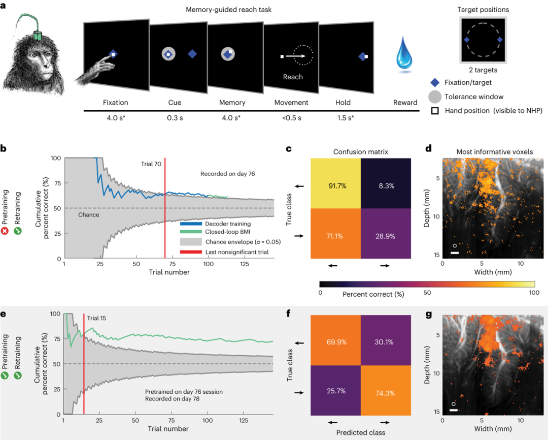 为了测试fUS-BMI的可行性,研究者首先进行了在线闭环的两个运动方向上的解码。在猴子根据记忆引导完成左右眼动任务时记录实时的fUS数据。在得到100个成功试次的数据后,实验切换到闭环解码阶段:猴子只能通过运动的意图来控制任务方向,并每次都会被告知BMI预测出来的是左边还是右边。在第二个阶段中,解码器在55次训练试验后准确性显著提高,并在第114次试验达到82%准确性。