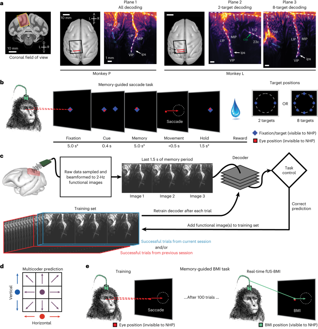 简单来说,研究者通过fUS从两只恒河猴的后顶叶皮层获取它们执行眼睛和手部运动时的数据。经过训练,这些猴子能够使用脑机接口(BMI)实时控制最多八个运动方向。他们还开发了一种使用先前会话的数据进行预训练的脑机接口(BMI)方法。这样就能在随后的几天,甚至相隔数月的实验期间实现即时控制,而无需进行大量的重新校准。这项研究将人们的视野再次聚焦在这个带有浓浓科幻色彩的脑机技术上,从它身上,我们可以窥见“超声读心”技术背后的特点与突破。