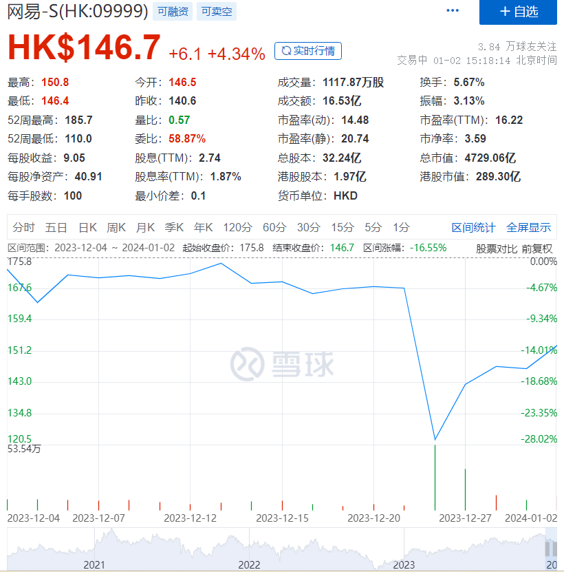 直到几天前游戏新规征求意见稿的推出。新规中表示,包括每日签到、首充福利等将不再被允许,这让网易的股价从每股159.8港元跌至122.6港元,震荡明显,而在网易传出与暴雪的绯闻后,股价又有回升的趋势。