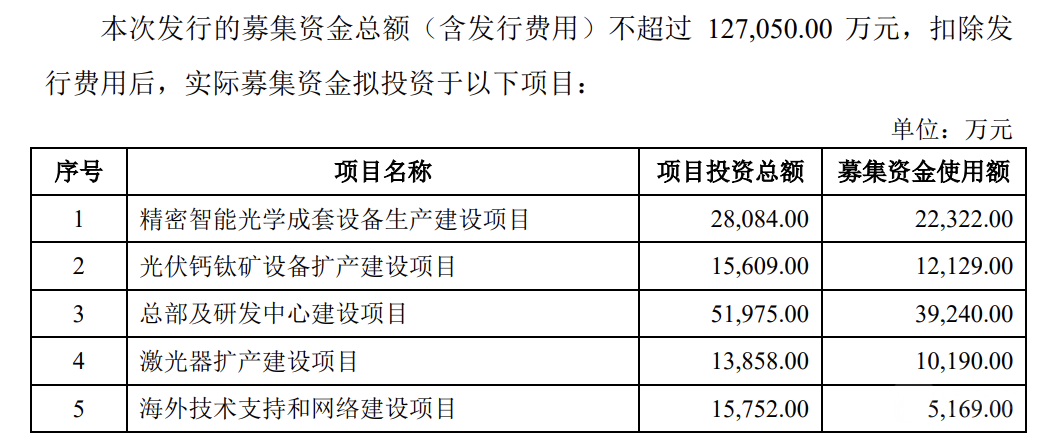 此次募资金额将用于精密智能光学成套设备生产建设项目(下称项目一)、光伏钙钛矿设备扩产建设项目(下称项目二)、总部及研发中心建设项目(下称项目三)、激光器扩产建设项目(下称项目四)、海外技术支持和网络建设项目(下称项目五)和补充流动资金。
