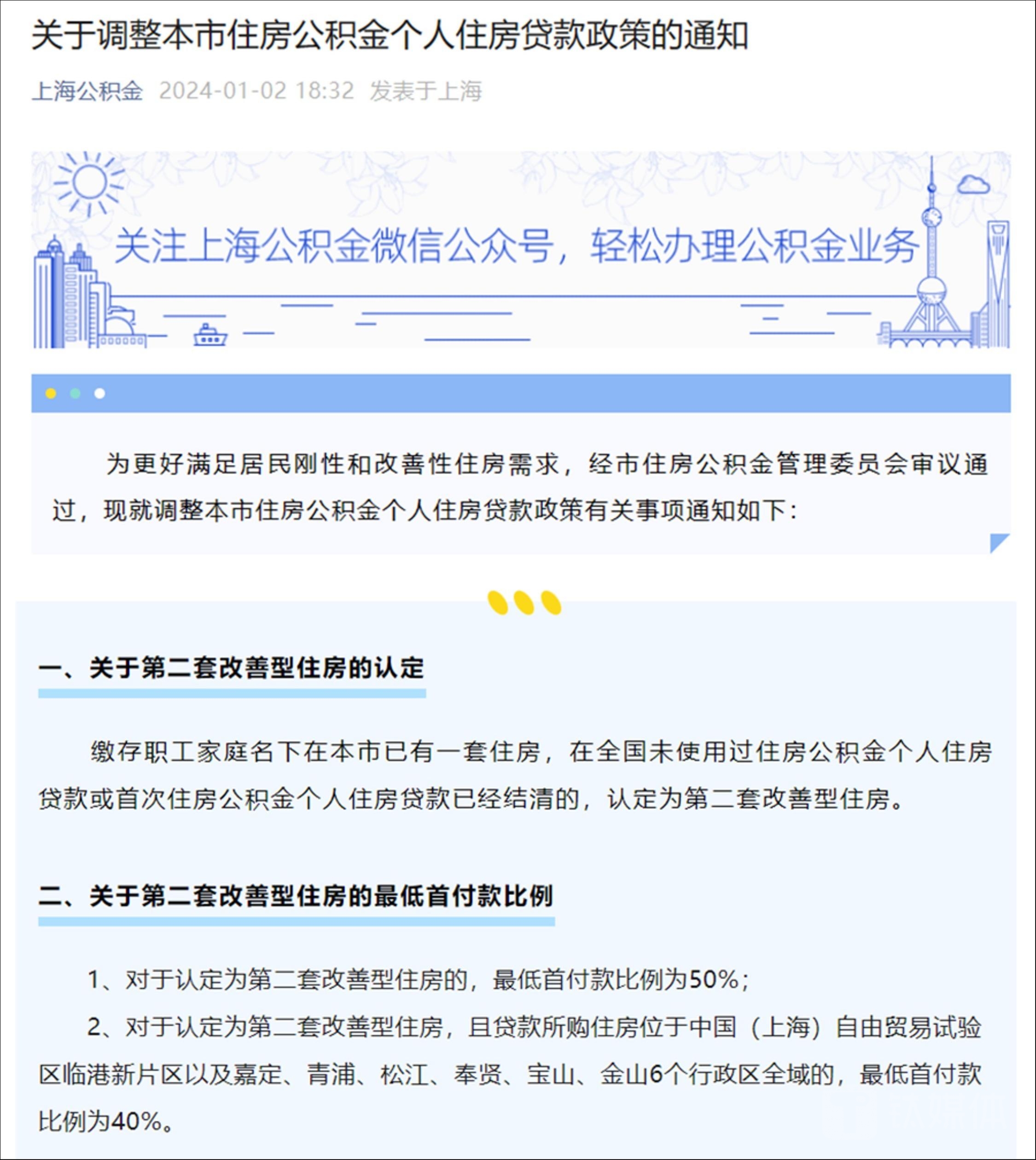 1月2日,上海市公积金管理中心发布《关于调整本市住房公积金个人住房贷款政策的通知》,对住房公积金个人住房贷款政策进行调整,内容涉及第二套改善型住房的认定和第二套改善型住房的最低首付款比例。
