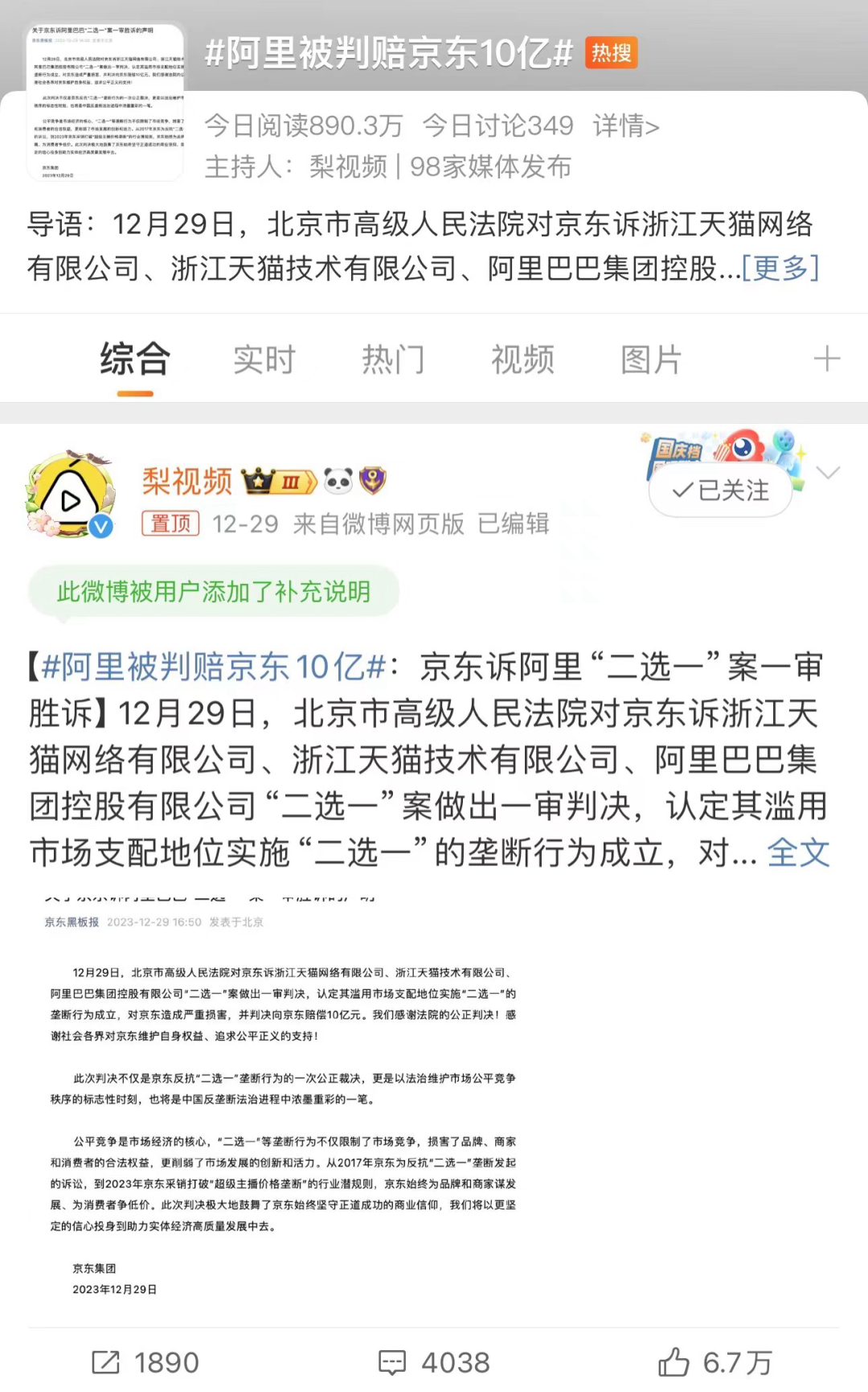 12月29日,北京市高级人民法院对京东诉浙江天猫网络有限公司、浙江天猫技术有限公司、阿里巴巴集团控股有限公司“二选一”案做出一审判决,认定其滥用市场支配地位实施“二选一”的垄断行为成立,对京东造成严重损害,并判决向京东赔偿10亿元。