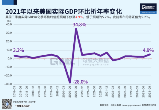 实际上,美国季度GDP除了在2022年前两个季度陷入同比负增长之后,已经连续5个季度同比增长,今年第三季度的GDP增速更是达到惊人的4.9%。