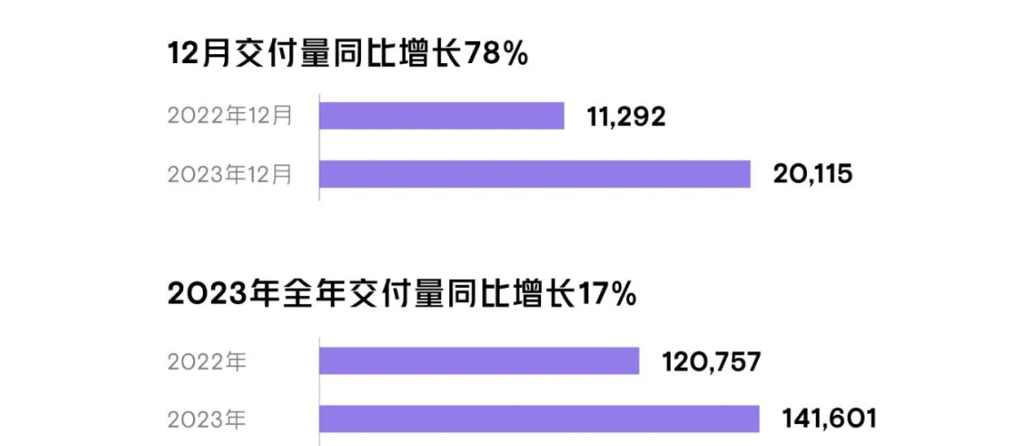 其他造车新势力方面,2023年12月,零跑汽车交付量达18,618台,连续刷新交付量历史新高,实现同比增长119%。2023年累计交付144,155台,同比增长超29%。
