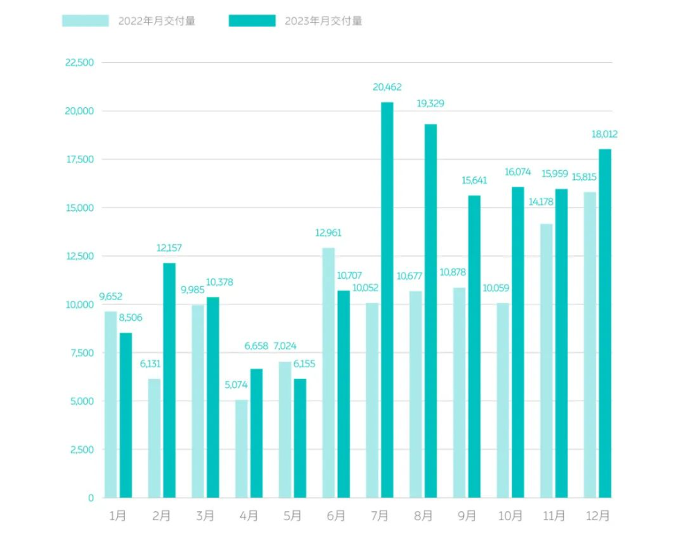 2023年12月,蔚来交付新车18,012台,同比增长13.9%;2023年四季度,蔚来共交付新车50,045台,同比增长25.0%,季度交付量超交付指引;2023年全年,蔚来共交付新车160,038台,同比增长30.7%;截至2023年12月31日,蔚来新车已累计交付449,594台,持续引领高端纯电市场。