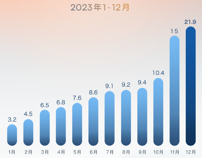 2023年12月,AITO问界系列交付新车24,468辆,环比增长29.96%,2023全年累计交付94,380辆。