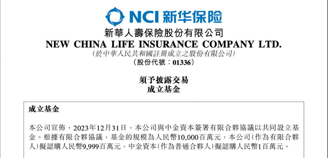 投资界—解码LP获悉,1月1日晚,新华保险公告称,公司已与中金资本签署有限合伙协议以共同设立基金,规模人民币100亿。